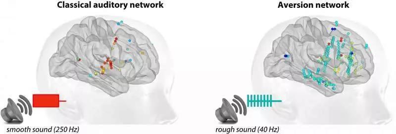 当声音被感知为平滑(高于130 Hz)时,上颞叶的听觉皮层被激活。梅格万德说:“这是传统的听力神经环路。” 但是,当感觉到声音粗糙(尤其频率为40至80 Hz之间)时,它们会引起持续的反应,从而额外激活了许多不属于常规听觉系统的皮质和皮质下区域。“这些声音激活了杏仁核,海马体和岛叶等与厌恶和疼痛有关的领域。这就解释了参与者为何感到他们难以忍受。”