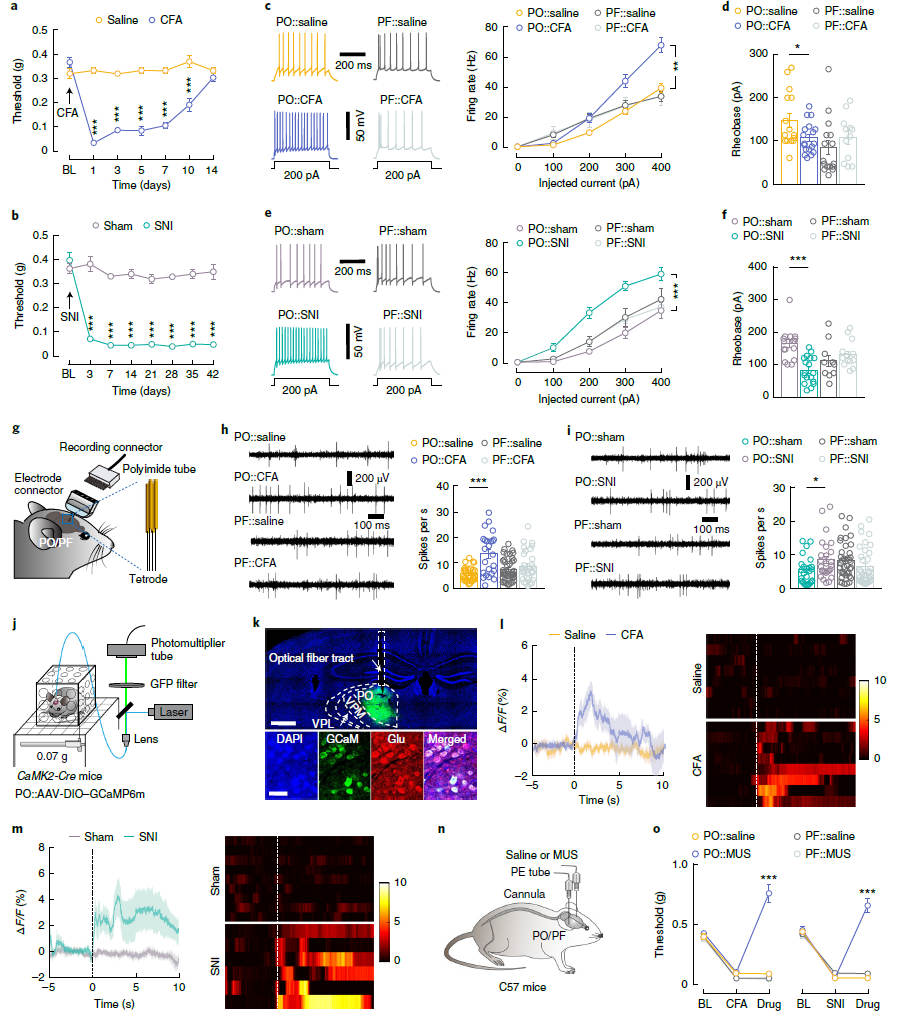 丘脑是痛觉信息传导的中继站,汇聚整合来自脊髓和脑干等核团的疼痛信号,最后通过丘脑-皮层连接对疼痛信息区分和精细加工。该研究以小鼠足底炎症和神经结扎作为组织损伤疼痛模型,综合运用病毒示踪、在体多通道/光纤记录和双光子钙成像等手段研究发现,丘脑后核(PO)投射至初级感觉皮层(S1)的神经环路(POGlu→S1Glu)参与组织损伤产生的痛敏。此外,慢性应激产生抑郁样行为的小鼠也表现出痛敏(作为抑郁症患者躯体疼痛的动物模型)。有意思的是,在该模型动物上,调控POGlu→S1Glu神经环路活性并不能影响痛敏行为,但却发现丘脑束旁核(PF)投射至前扣带回皮层(ACC)神经环路(PFGlu→ACCGABA→Glu)参与抑郁情绪产生的痛敏。本研究不仅为不同病因产生的躯体疼痛(临床治疗方案和治疗效果也不尽相同)发病机理提出了深入的和新的理论见解,也可能为临床上利用rTMS等精准靶向特定神经环路开展物理干预治疗提供新策略。