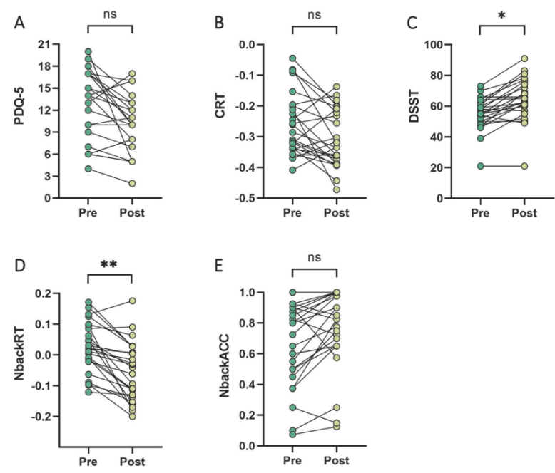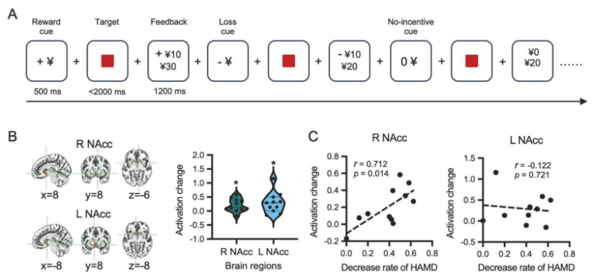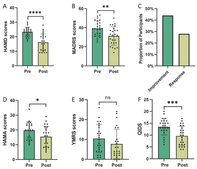 在这项研究中,研究人员招募了36名双相抑郁患者,其中25人完成了为期5天的干预,包括10次tTIS治疗。每次治疗持续20分钟,最大电流强度为2毫安,刺激频率为40赫兹。结果显示,治疗后患者的抑郁症状显著减轻,汉密尔顿抑郁量表(HAMD-17)平均得分从23.36降至16.16(p<0.0001),蒙哥马利-阿斯伯格抑郁量表(MADRS)得分从39.12降至31.28(p<0.01)。此外,患者的焦虑症状也有所改善,汉密尔顿焦虑量表(HAMA)得分从19.68降至15.44(p<0.05)。认知功能评估显示,患者的记忆和执行功能有所改善,且奖励相关的大脑活动变化与症状减轻呈正相关。