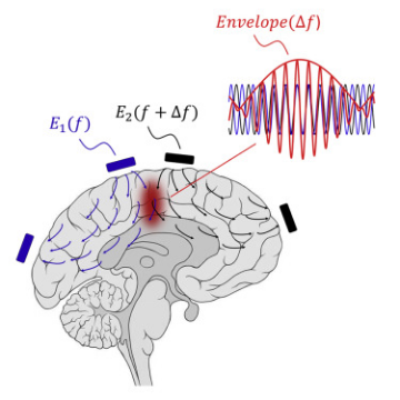 tTIS是一种新兴的非侵入性脑刺激技术,通过在大脑深部结构产生时域上的干涉来调节神经元活动。其原理是利用两个高频正弦波形,通过它们的相互作用在目标脑区产生低频调制的电场。这种技术的优势在于能够精准刺激大脑深部结构,如参与奖励处理和情绪调节密切相关的关键区域,伏隔核(Nucleus Accumbens, NAcc)。