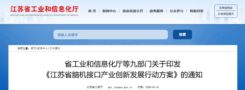 为落实工业和信息化部等七部门意见,江苏省于2026年3月10日正式发布《关于推动脑机接口产业创新发展的实施意见》,标志着这一未来产业在江苏进入系统化布局新阶段。