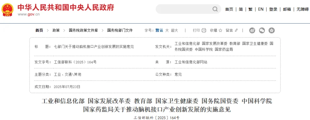 工信部等七部门:于2025年发布《关于推动脑机接口产业创新发展的实施意见》