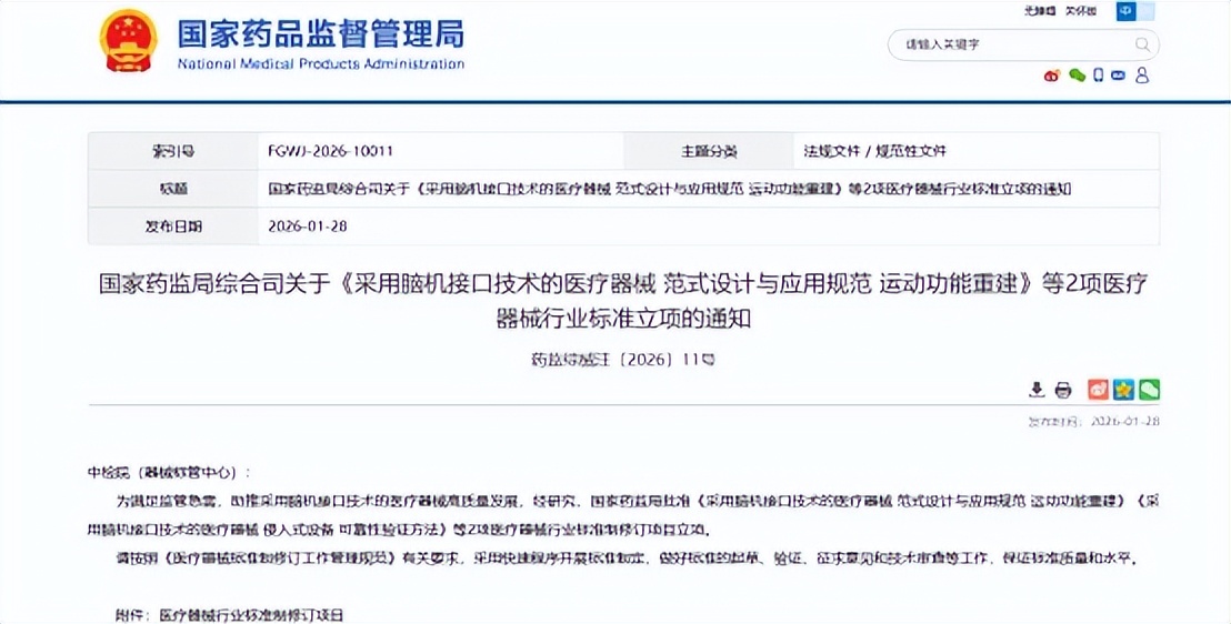 国家药监局:批准首部脑机接口医疗器械标准(2026年1月实施)