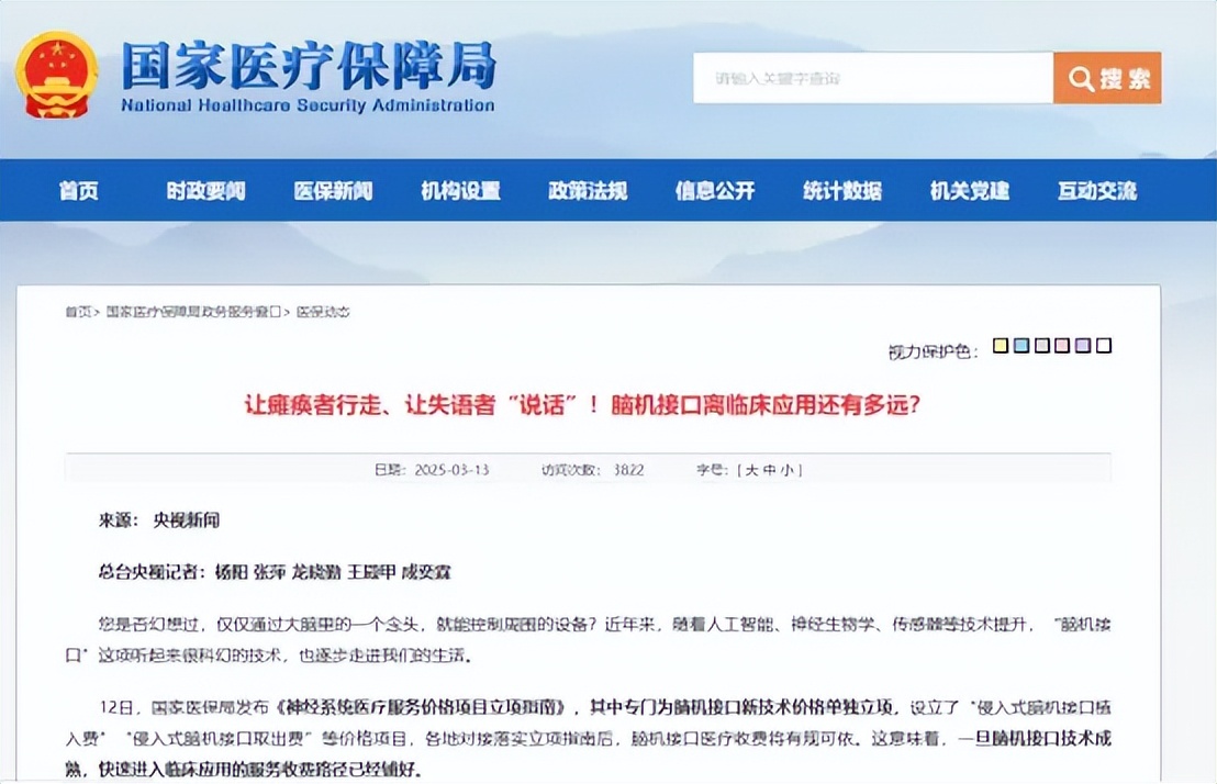 国家医保局:新设侵入式脑机接口植入费等价格项目