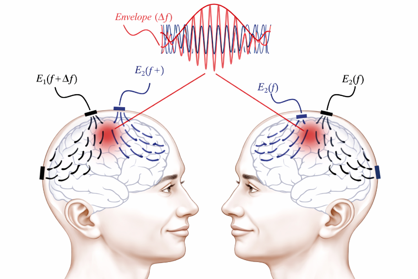 •深层干涉:这两股高频电流单独作用时,神经元无法响应(因为频率太高)。但当它们在大脑深处交汇时,会产生一个低频差频包络(如40Hz)。