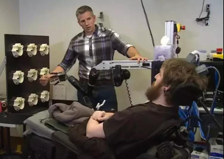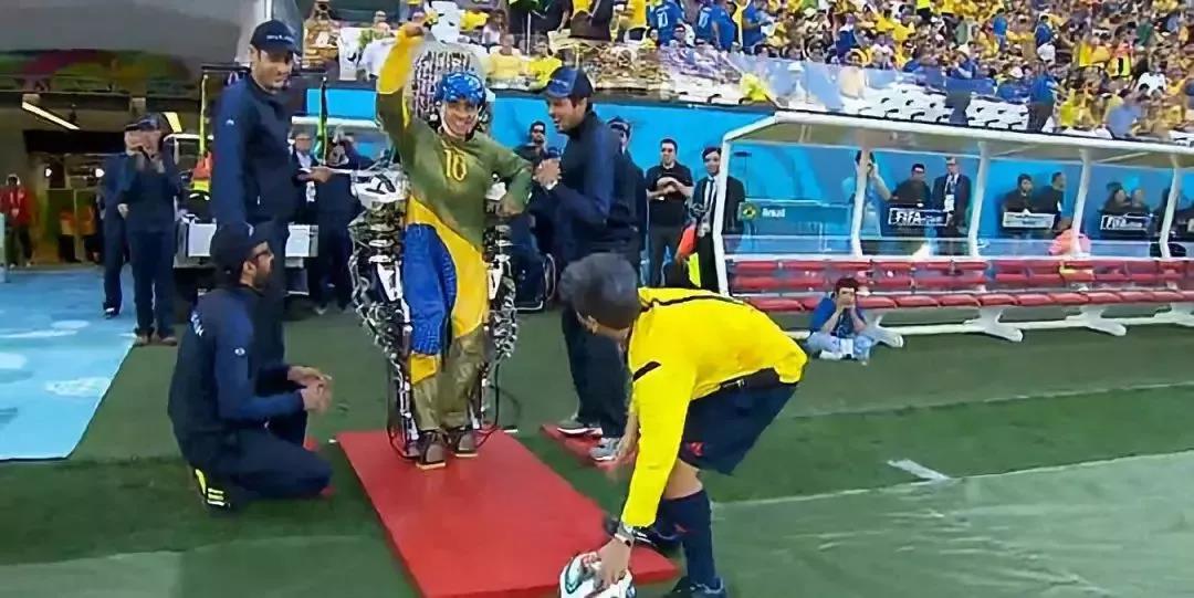 2014年巴西世界杯开幕式,一名腰部以下瘫痪的少年,通过BCI控制的机器外骨骼从轮椅上站起来,向前迈出几步,踢出了世界杯的第一脚球。